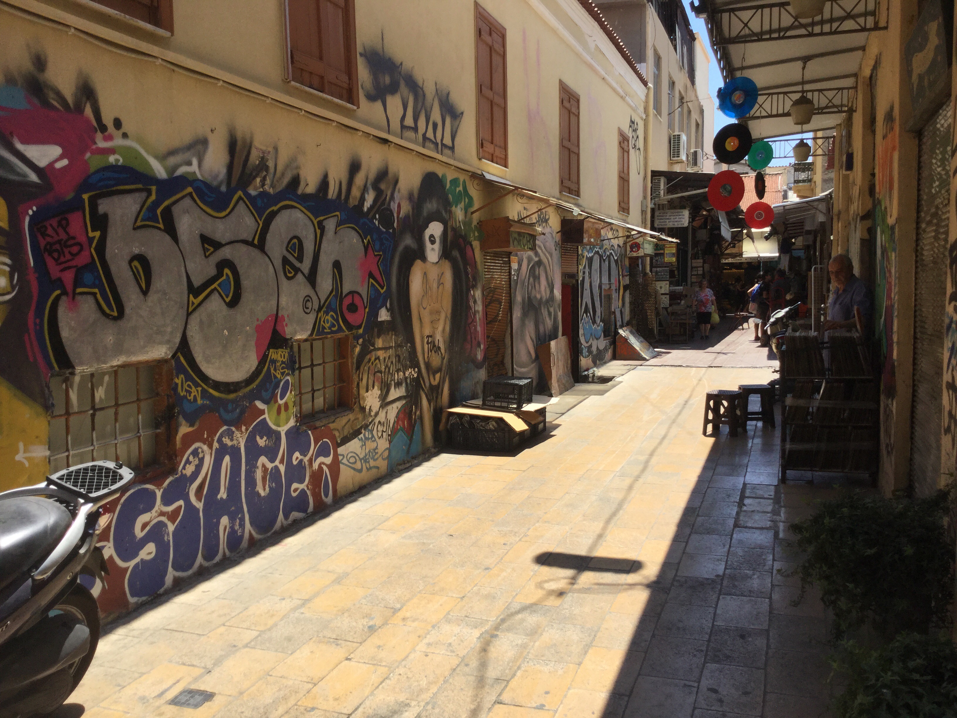 This is a grungy world only metres but on the other hand a thousand miles away from Ermou street the bustling modern shopping strip popular with the people of Athens.